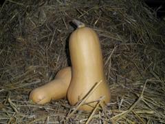 Een langwerpige pompoen met een buikje. Alleen in het buikje zitten zaden, dus veel vruchtvlees. Deze pompoen wordt erg veel gebruikt voor de consumptie en heeft een muskaataroma.